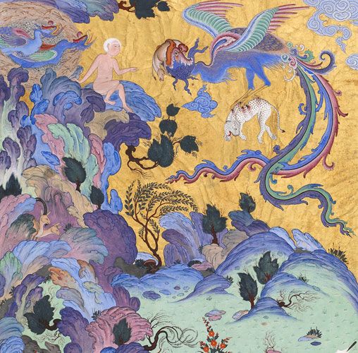 Simurgh returning to nest to Zal and its chicks, Shahnameh Tahmasbi