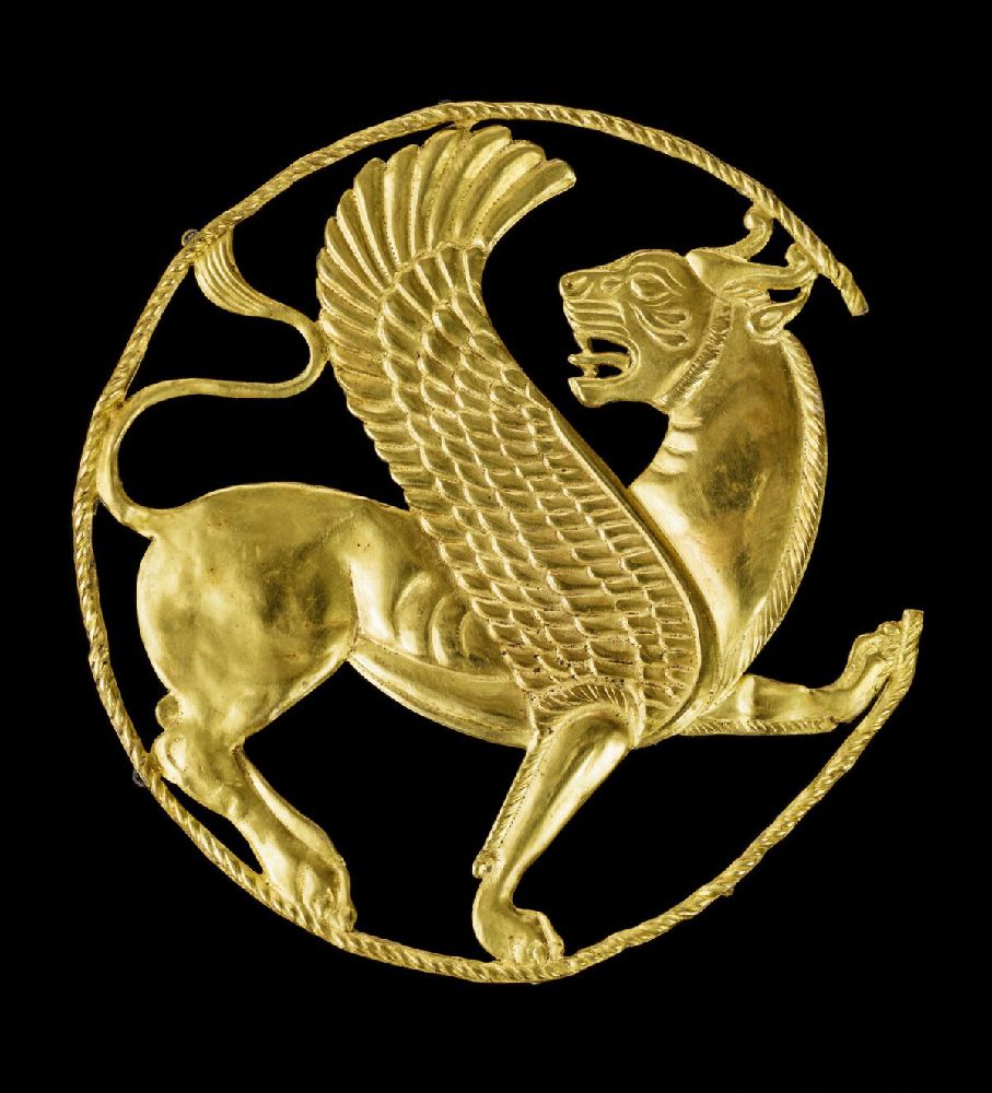 Plaque with a Winged Lion-Griffin, Achaemenid, 500–330 BC. Gold, 1/8 × 4 1/8 × 4 1/4 in. The Oriental Institute of the University of Chicago.